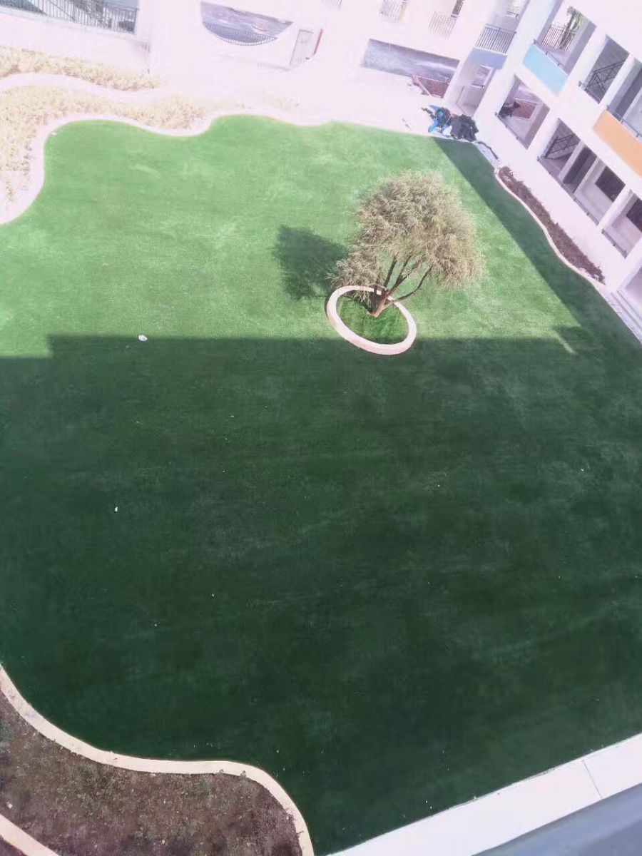 因為這個綠化場地是異形的需要定制,所以選擇鋪裝人造草坪也會相對比較簡單,人造草坪具備的其中一個優(yōu)點就是可以根據(jù)場地定制設計然后鋪裝出來,效果也是很好的,可以看下面的施工完成圖。